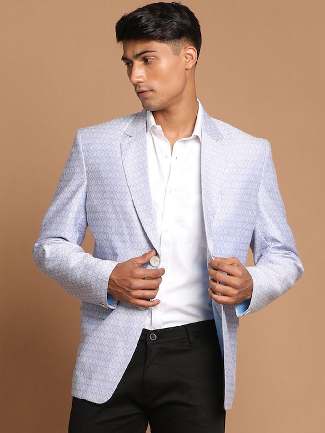 Men Lavender Coloured Self Design Single Breasted Ethnic Blazer
