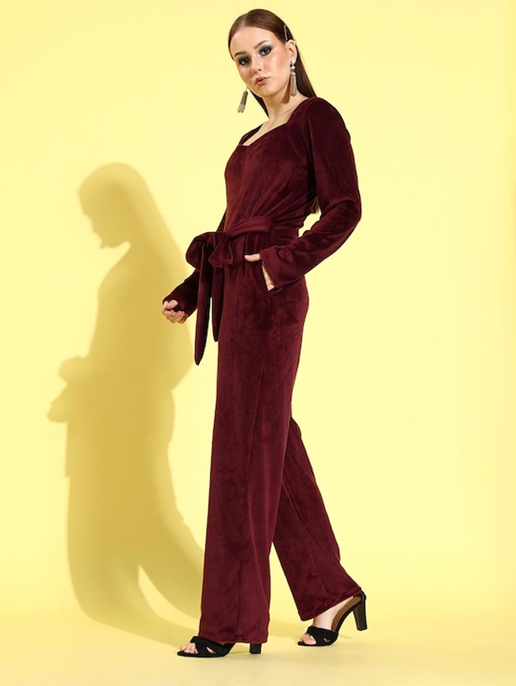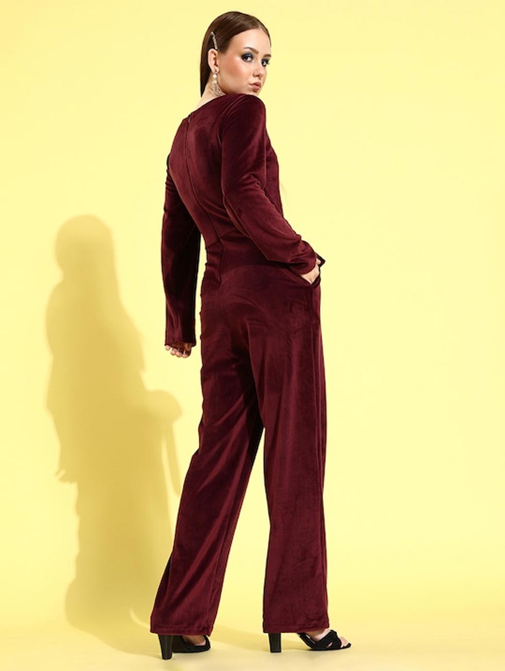 Burgundy solid basic jumpsuit ,has a sweetheart neck, long sleeves, 2 pockets