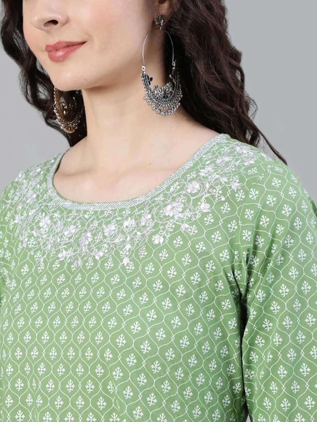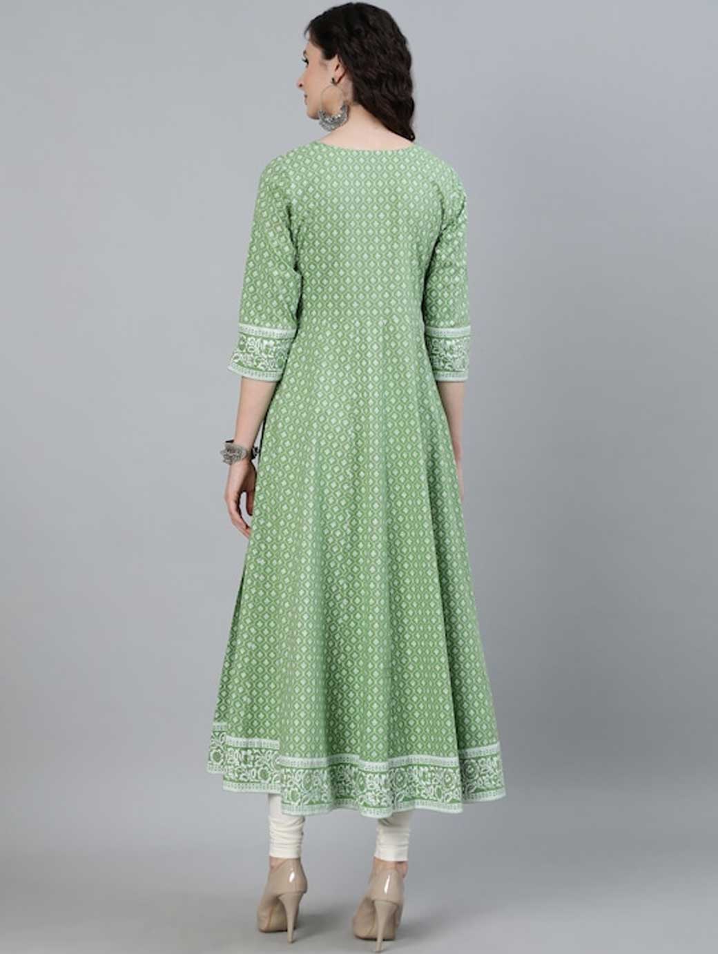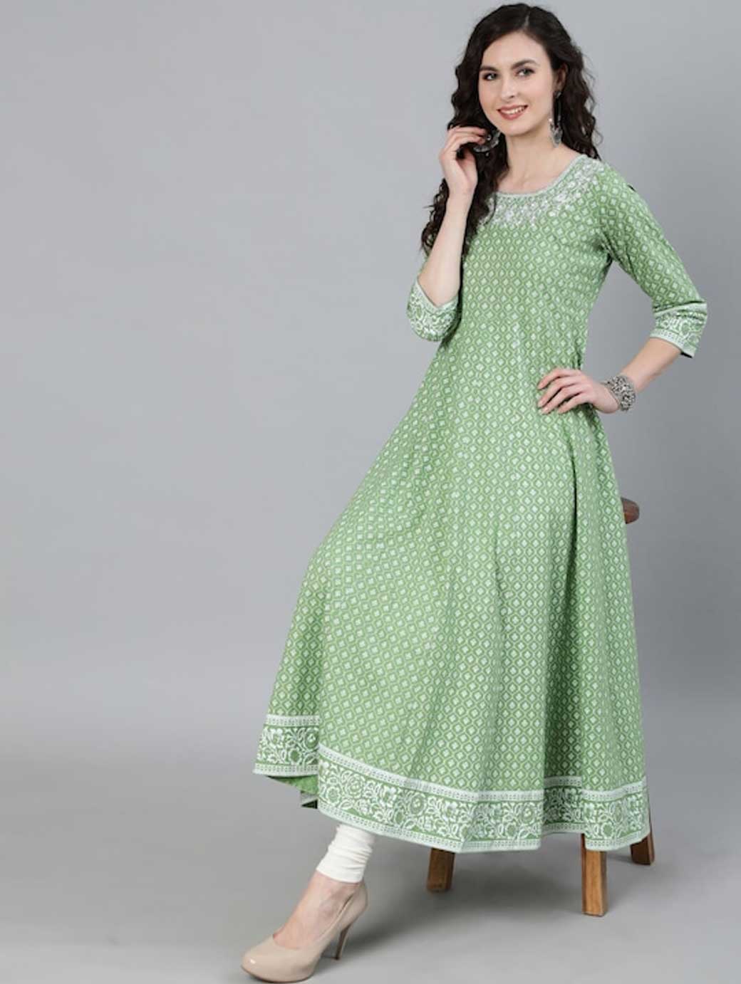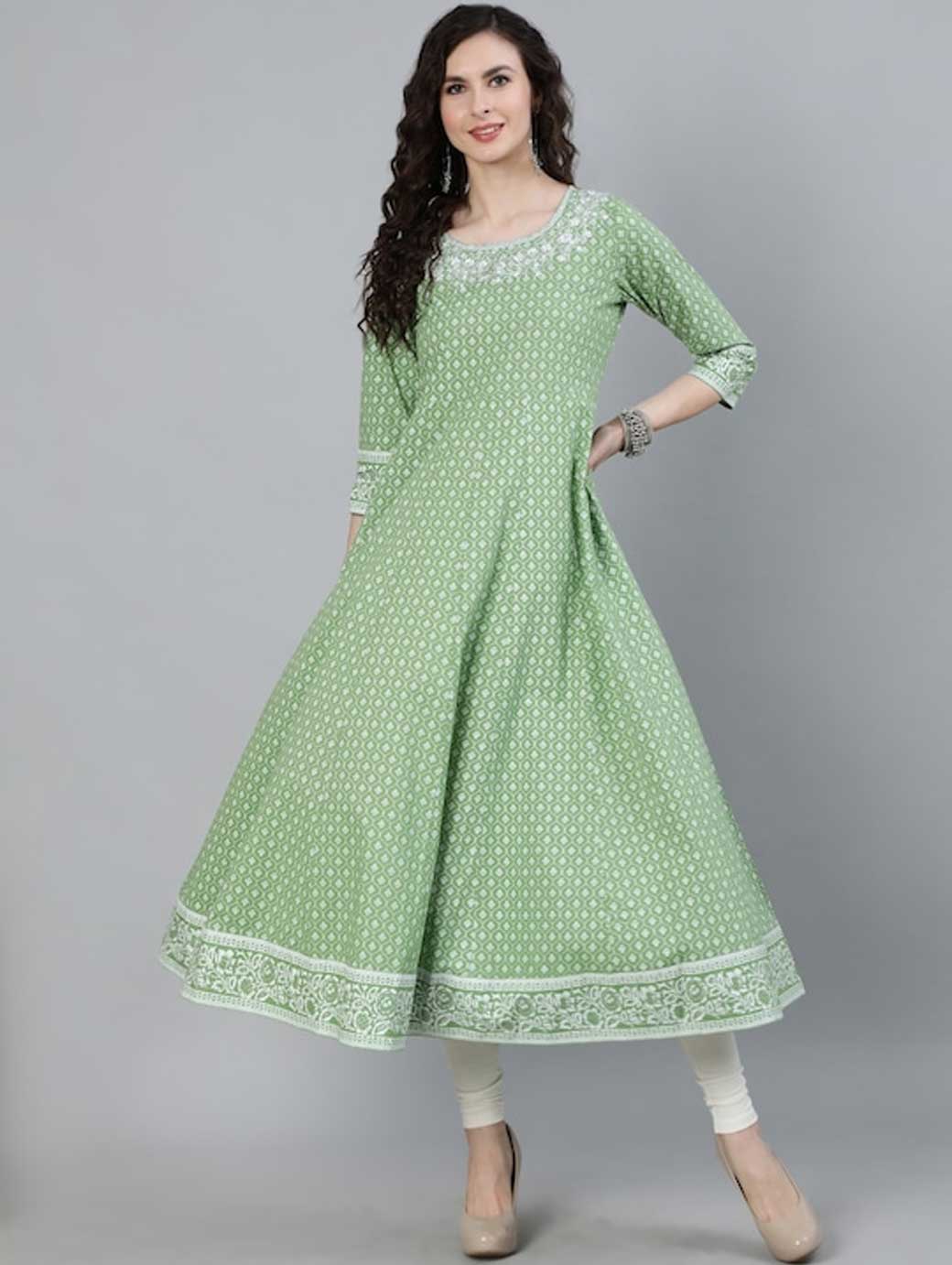 Green & White Ethnic motifs printed Round neck Three-quarter, regular sleeves Anarkali shape with empire style Ankle length with flared hem Handloom regular viscose rayon
