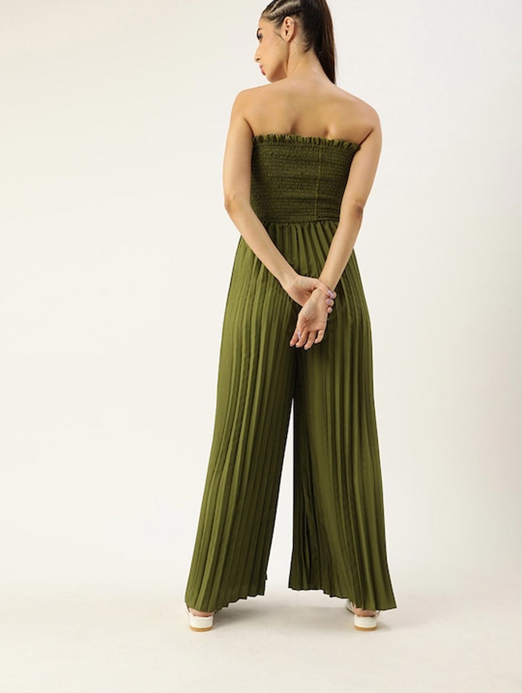 Women Olive Green Solid Accordion Pleated Smocked Basic Jumpsuit