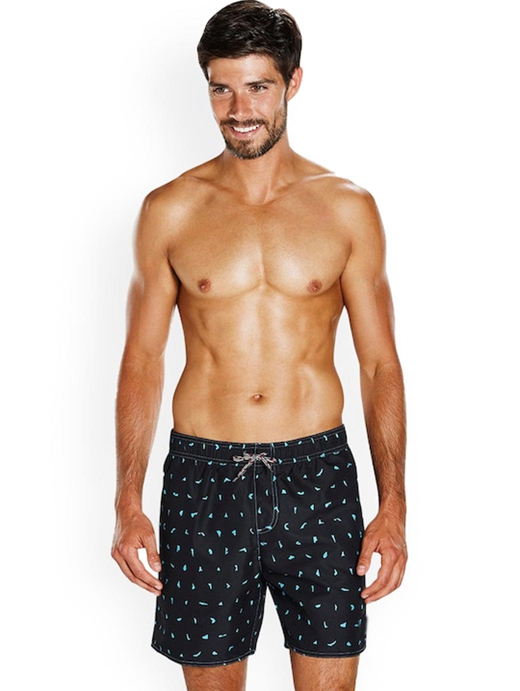 Black printed swim bottoms, has an elasticated waistband with drawstring closure