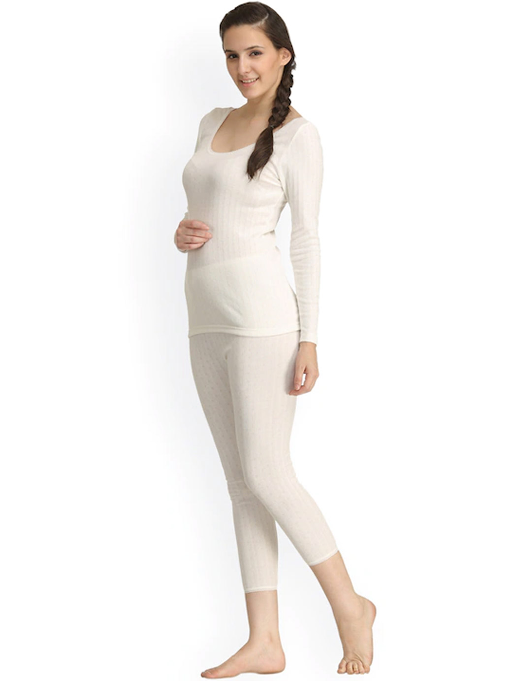 Off-white mid-rise three-fourth thermal leggings in a patterned weave, has an elasticated waistband, elasticated at the hems