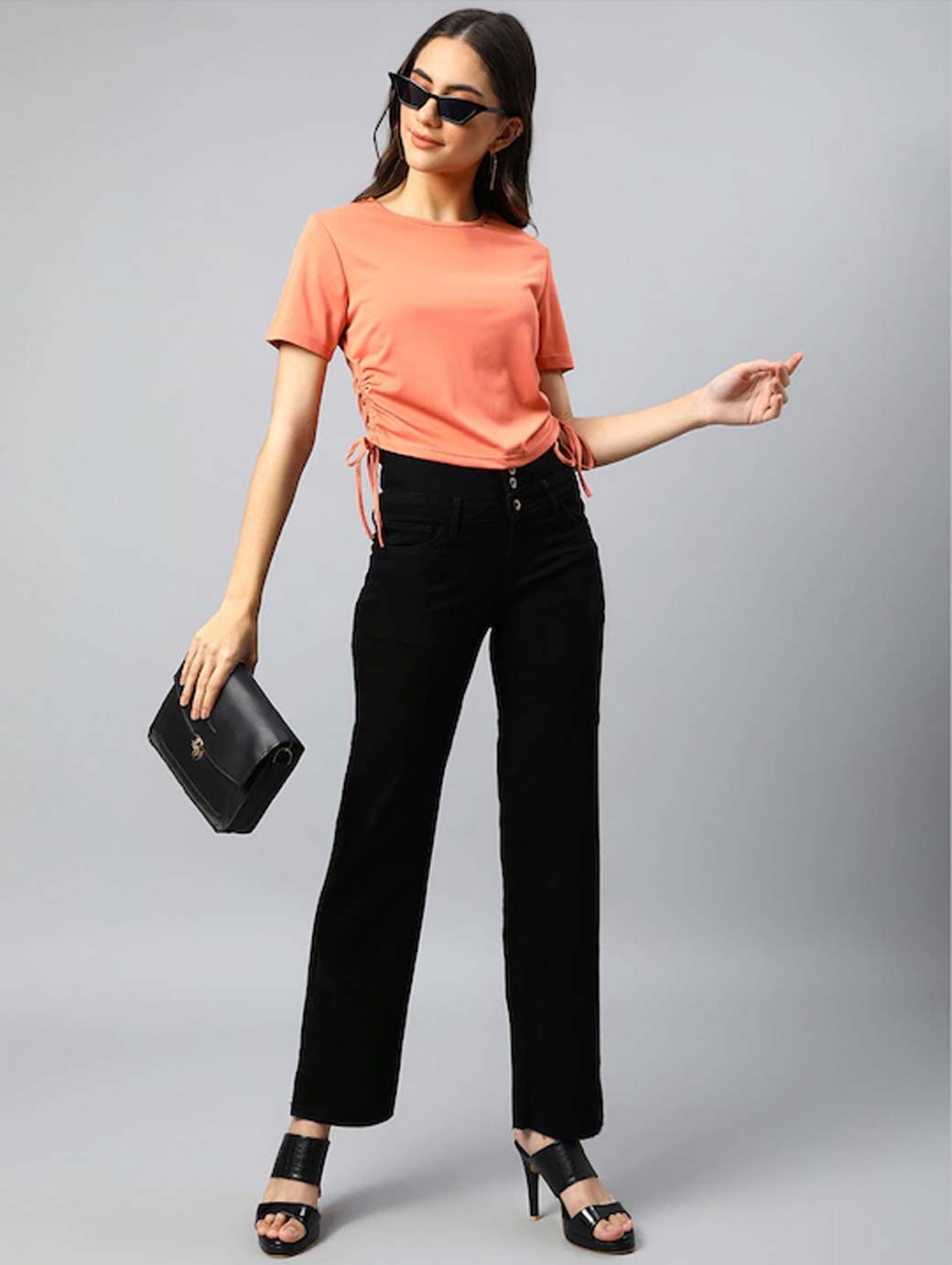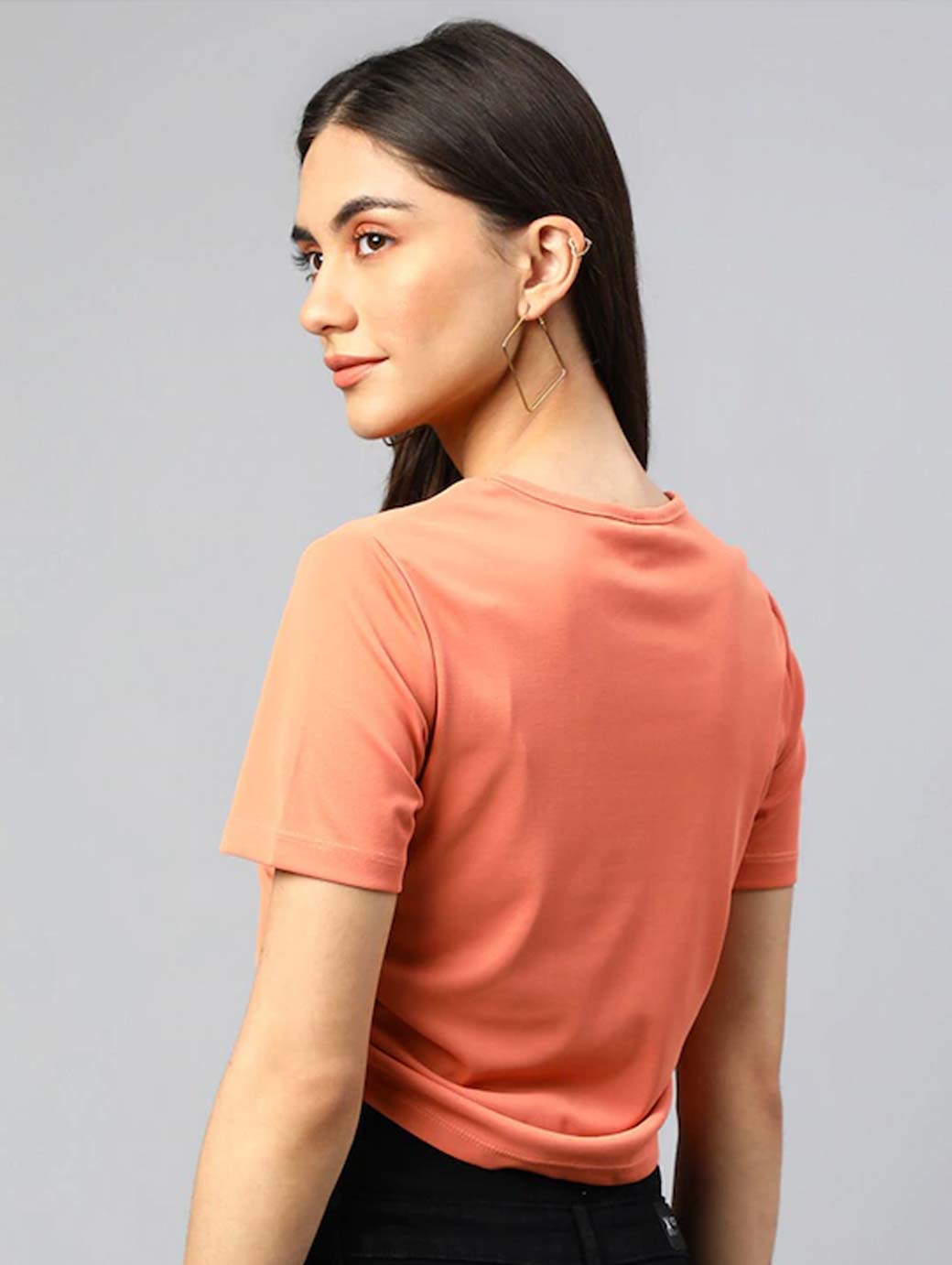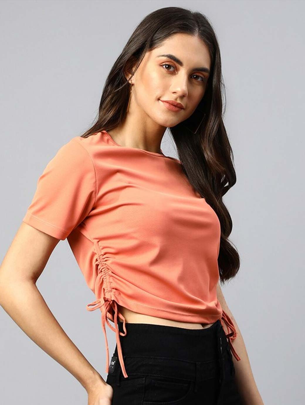 Peach-coloured crop regular top, Solid, Round neck, short, regular sleeves, Tie-ups detail, Knitted.
